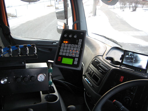 Die Steuerung aller Funktionen der Kehrhydraulik findet über elektromagnetische Ventile vom Bedienpult im Fahrerhaus statt.