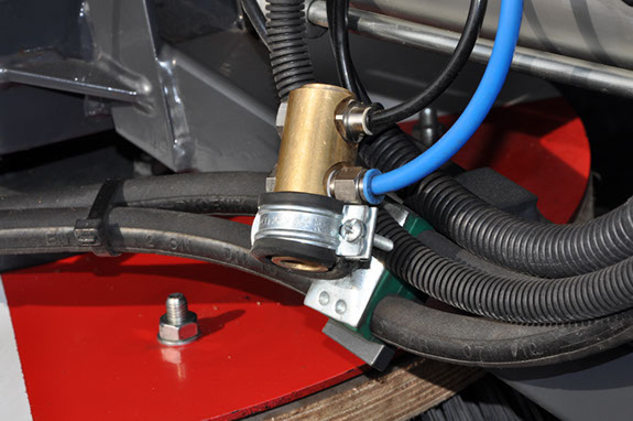 Das Zu- und Abschalten der Sprühnebeldüsen an den Kehraggregaten erfolgt über mengenregulierbare Absperrventile im Fahrerhaus.